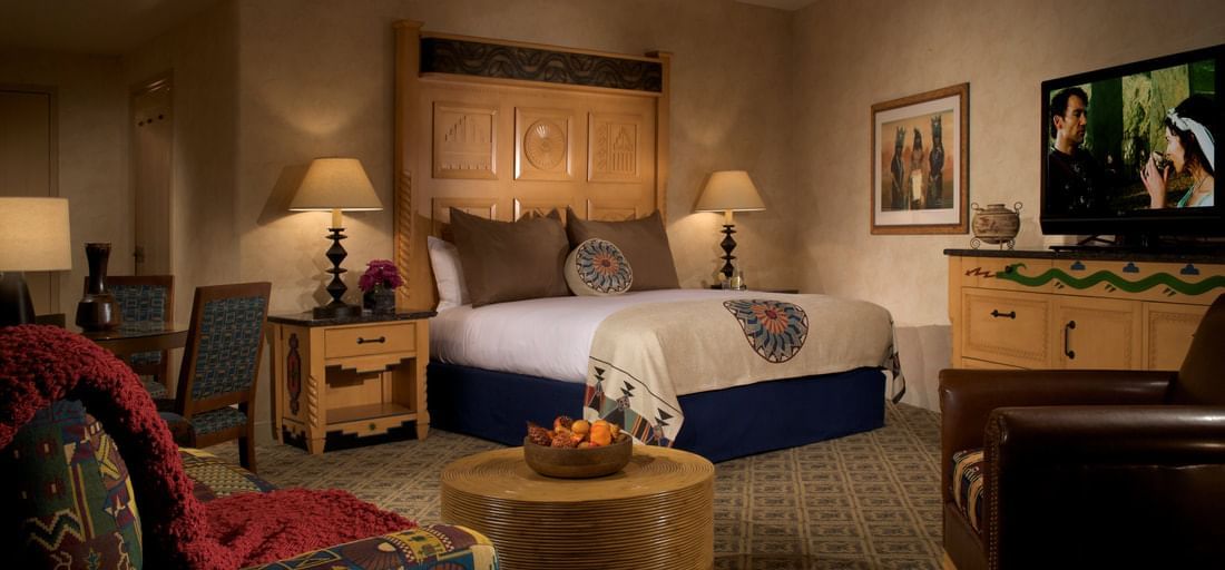 In addition to unique Native American Pueblo-style embellishments, this spacious guestroom at our beautiful New Mexico hotel offers the full range of ADA-compliant features. Select guestrooms feature a patio or balcony with incredible outdoor views the Sangre de Cristos and Jemez Mountains. Additionally, each room features original works by local artists and hand-designed furnishings.